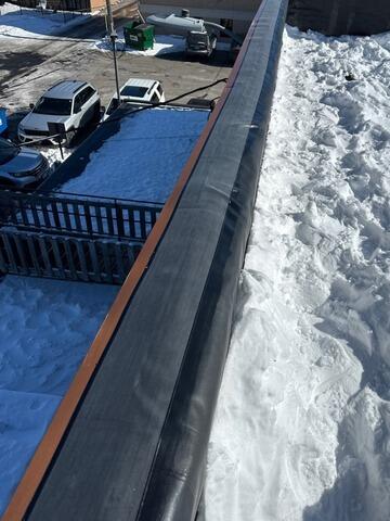 With the roof deck exposed and inspected, the installation of the new roofing system began. The team installed a tapered Poly ISO insulation system designed to achieve an R-35 rating, helping improve both drainage and energy efficiency. Low-rise foam adhesive secured the insulation boards, while screws and plates provided additional mechanical fastening. Once the insulation was in place, the EPDM membrane was rolled out and fully adhered using bonding adhesive to create a smooth, watertight surface. Flashings and primer were applied to key areas, and the parapet walls were fully adhered to ensure continuous waterproofing. The finishing touches included cap metal with a ¼-inch taper and 1-inch fill reaching X+10 on the main roof section, completing a long-lasting flat roofing system built to withstand the extreme conditions common in North Dakota.